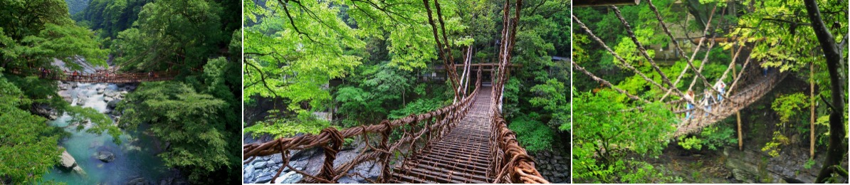 แล้วนำท่านชม สะพานแขวนคาซึระบาชิ ในอดีตสะพานแขวนที่ทำเถาวัลย์เป็นเส้นทางเดียวที่ผู้คนจะสามารถเข้าออกและขนส่งสินค้าข้ามแม่น้ำของ หุบเขาอิยะ ในอดีตหุบเขานี้เคยมีสะพานแขวน 13 แห่ง แต่ทุกวันนี้เหลืออยู่เพียง 3 แห่งเท่านั้น สะพานแขวนคาซึระบาชิเป็นสะพานแขวนที่ใหญ่ที่สุดที่เหลืออยู่และเป็นที่นิยมมากที่สุด สะพานที่ทอดยาว 45 เมตรข้ามแม่น้ำอิยะ ที่กลางหุบเขา มีมุมที่สามารถมองสายน้ำไหลด้านล่างจากความสูง 14 เมตร สะพานจะถูกสร้างขึ้นใหม่ทุกสามปี ยึดอยู่กับต้นซีดาร์ต้นสูงใหญ่ที่ปลายทั้งสองฝั่ง และมีสายลวดสลิงที่ซ่อนอยู่ภายในเถาวัลย์เพื่อความปลอดภัย เป็นสะพานที่สามารถข้ามไปได้ในทิศทางเดียวเท่านั้น